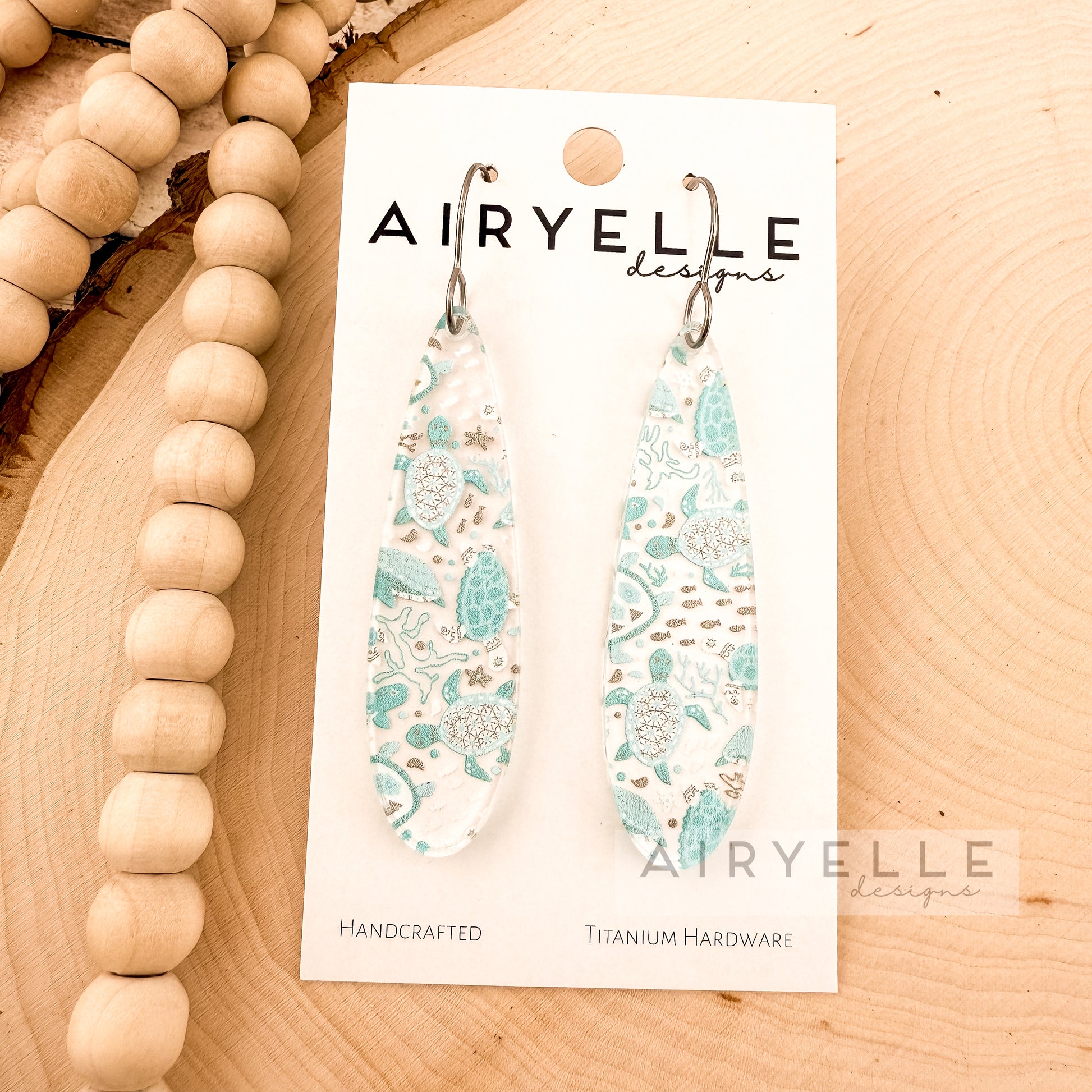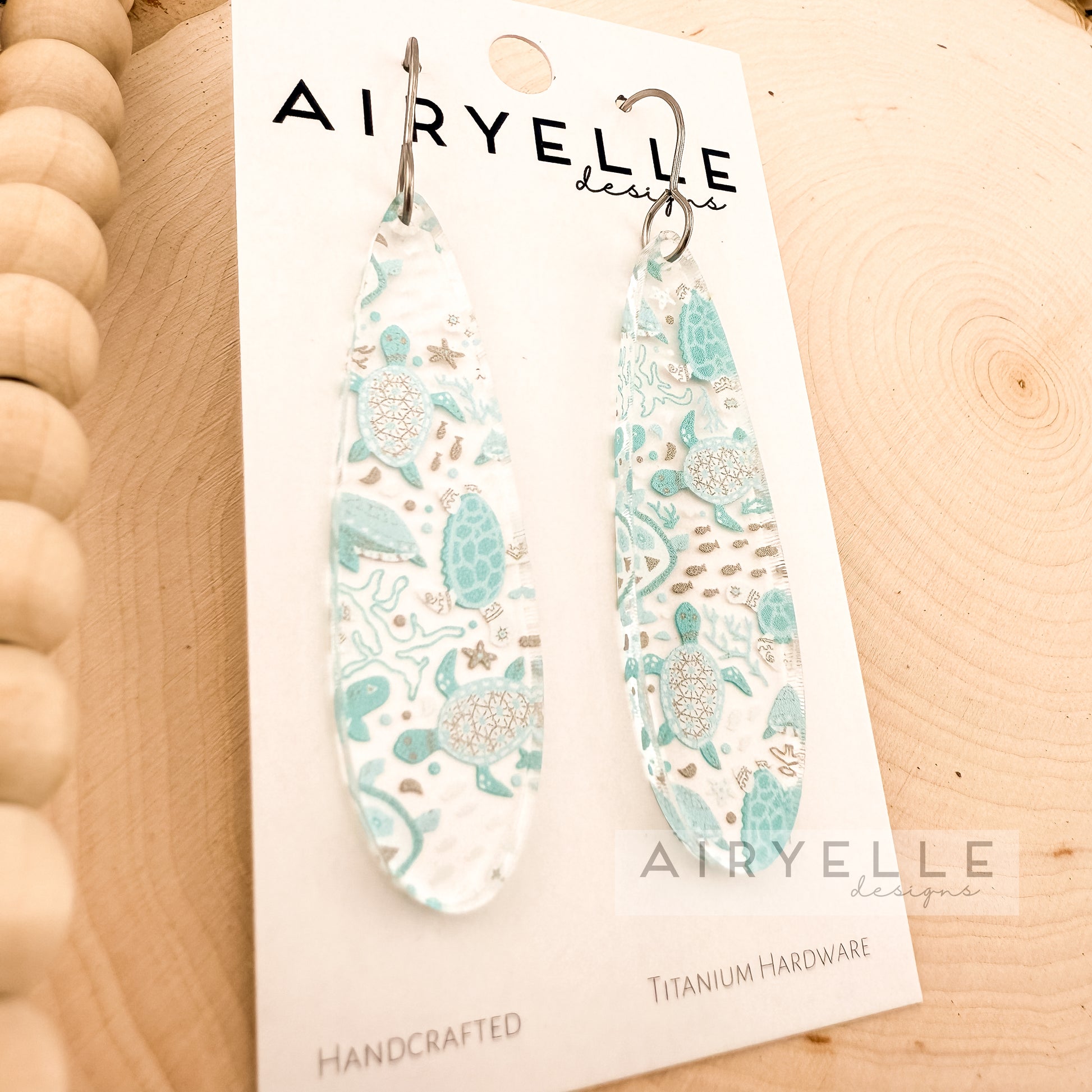 Aqua Sea Turtle Clear Acrylic Teardrop Bar Earrings