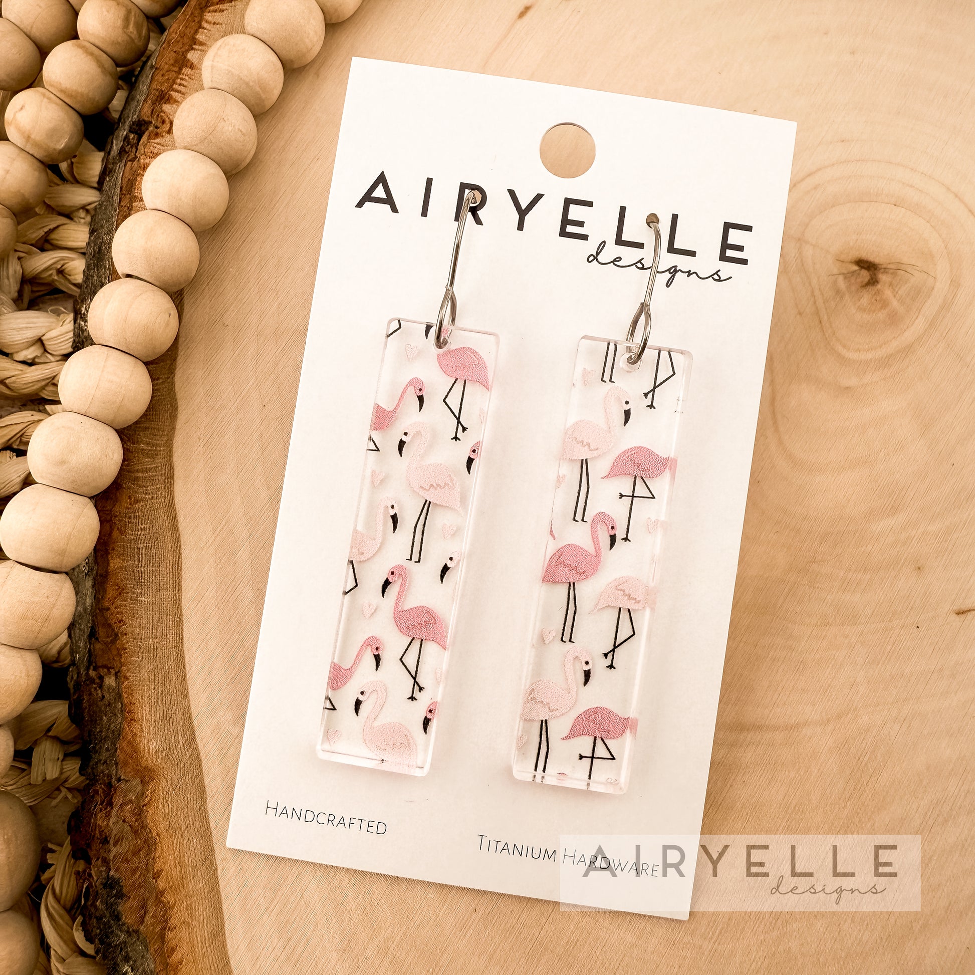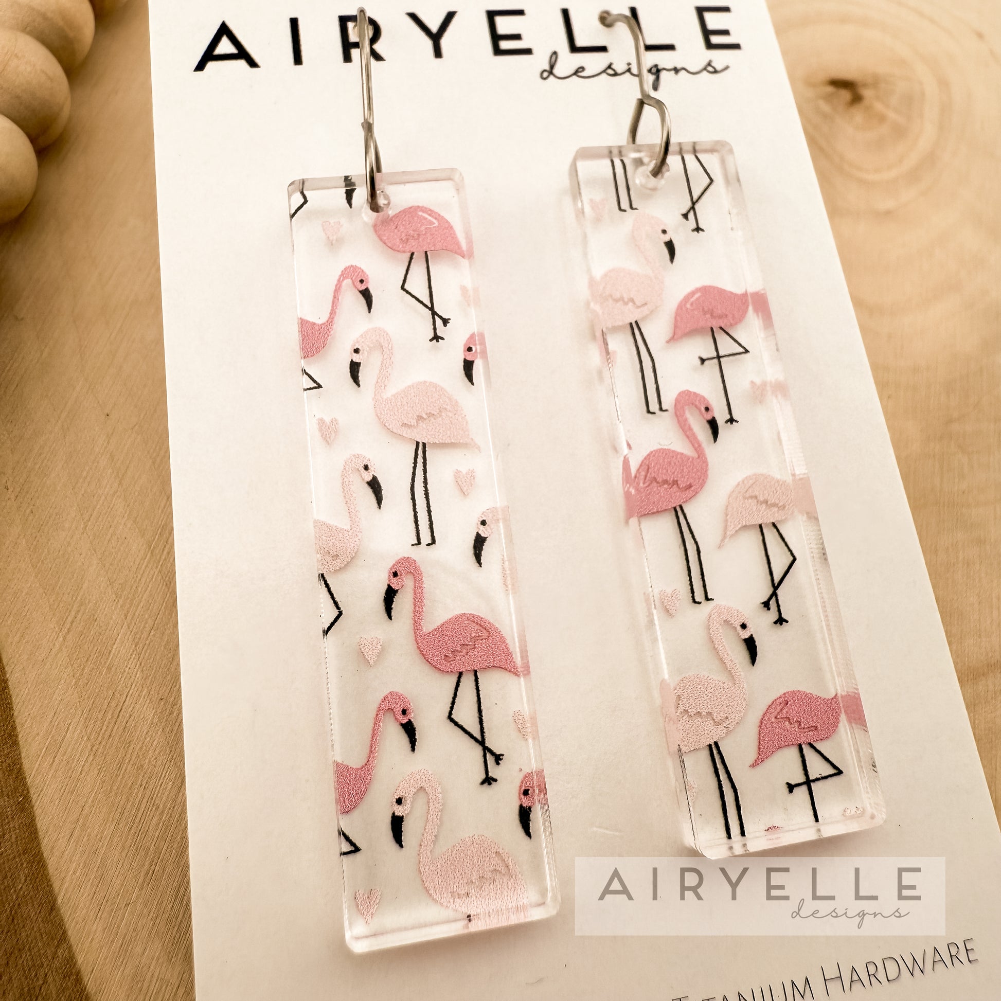 Materials: These beautiful earrings are made from clear acrylic with a UV printed flamingo pattern