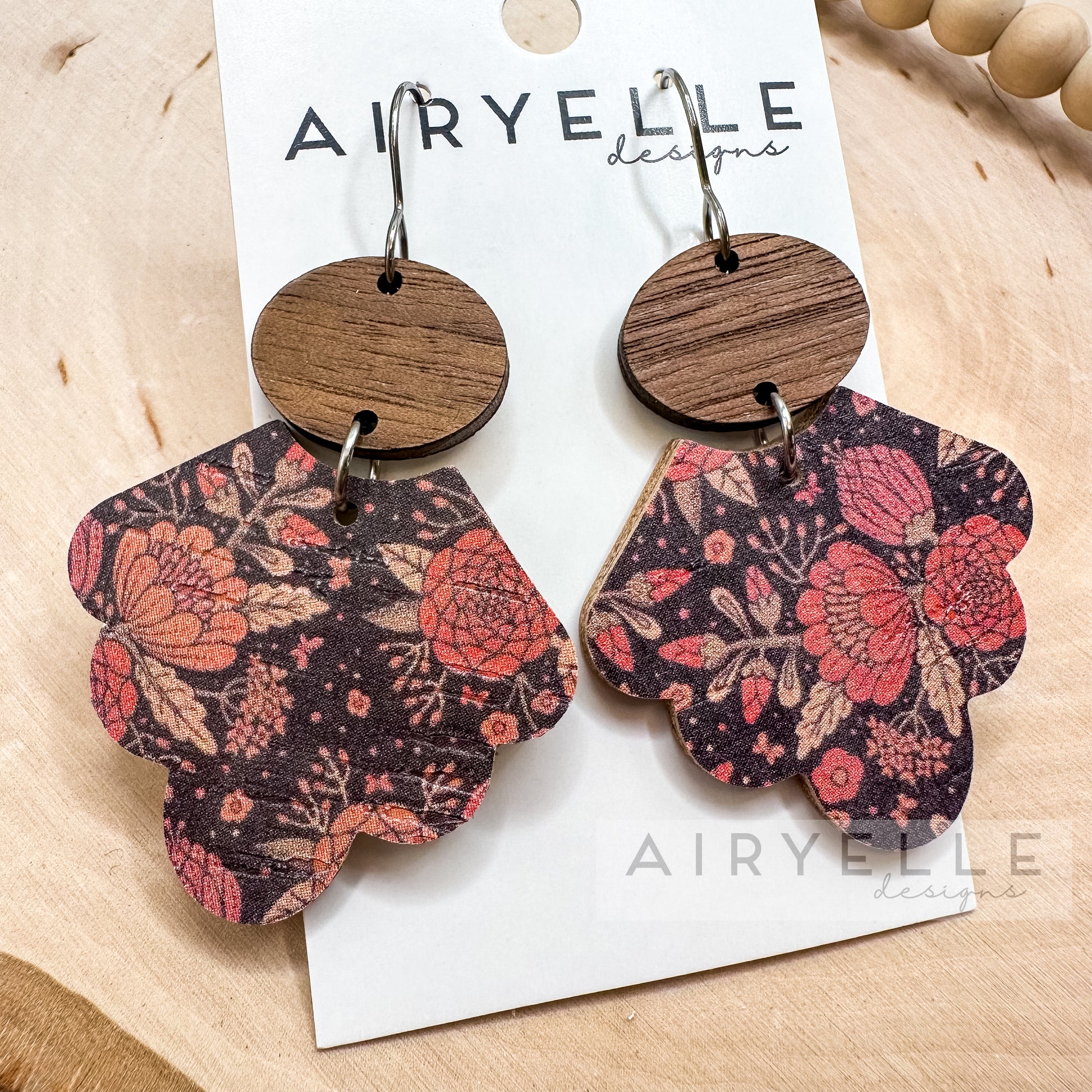 Autumn Floral Scalloped Cork + Leather Wood Earrings