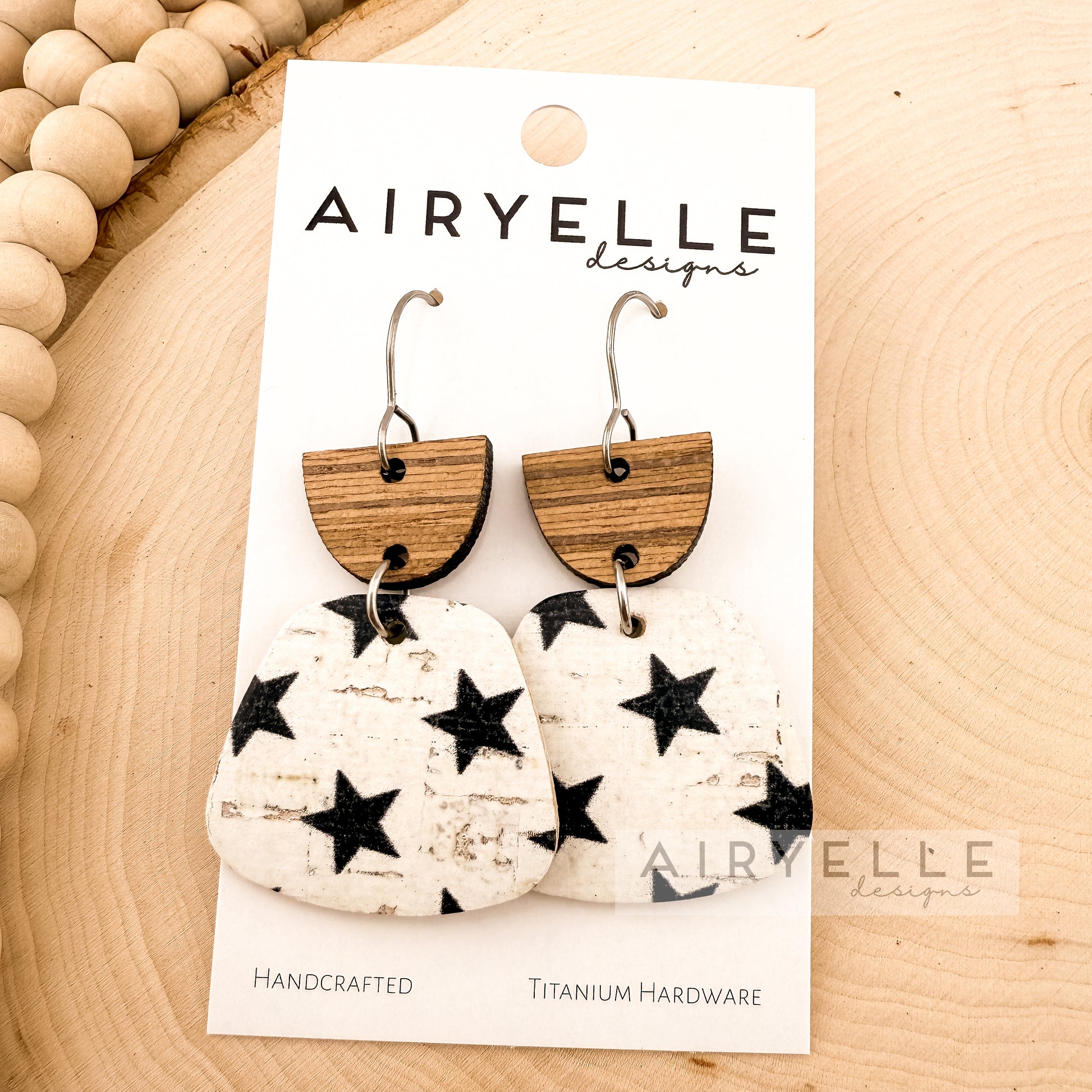Materials: These beautiful earrings are made from a light stained wood and printed cork backed with 100% cowhide leather.