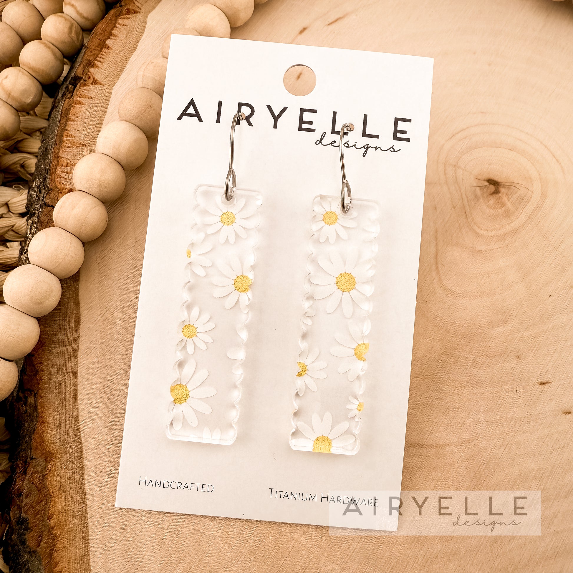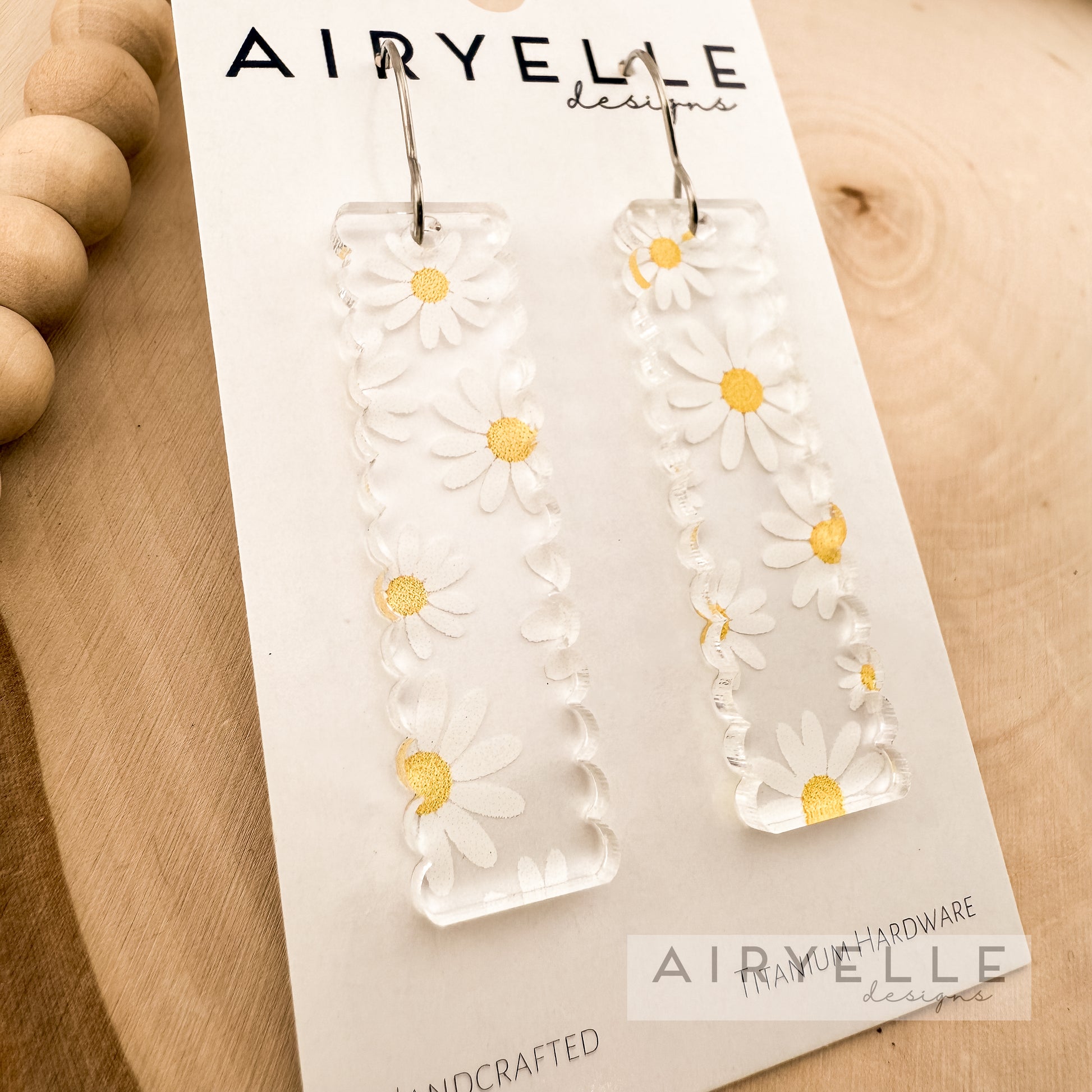 Materials: These beautiful earrings are made from clear acrylic with a UV printed daisy pattern
